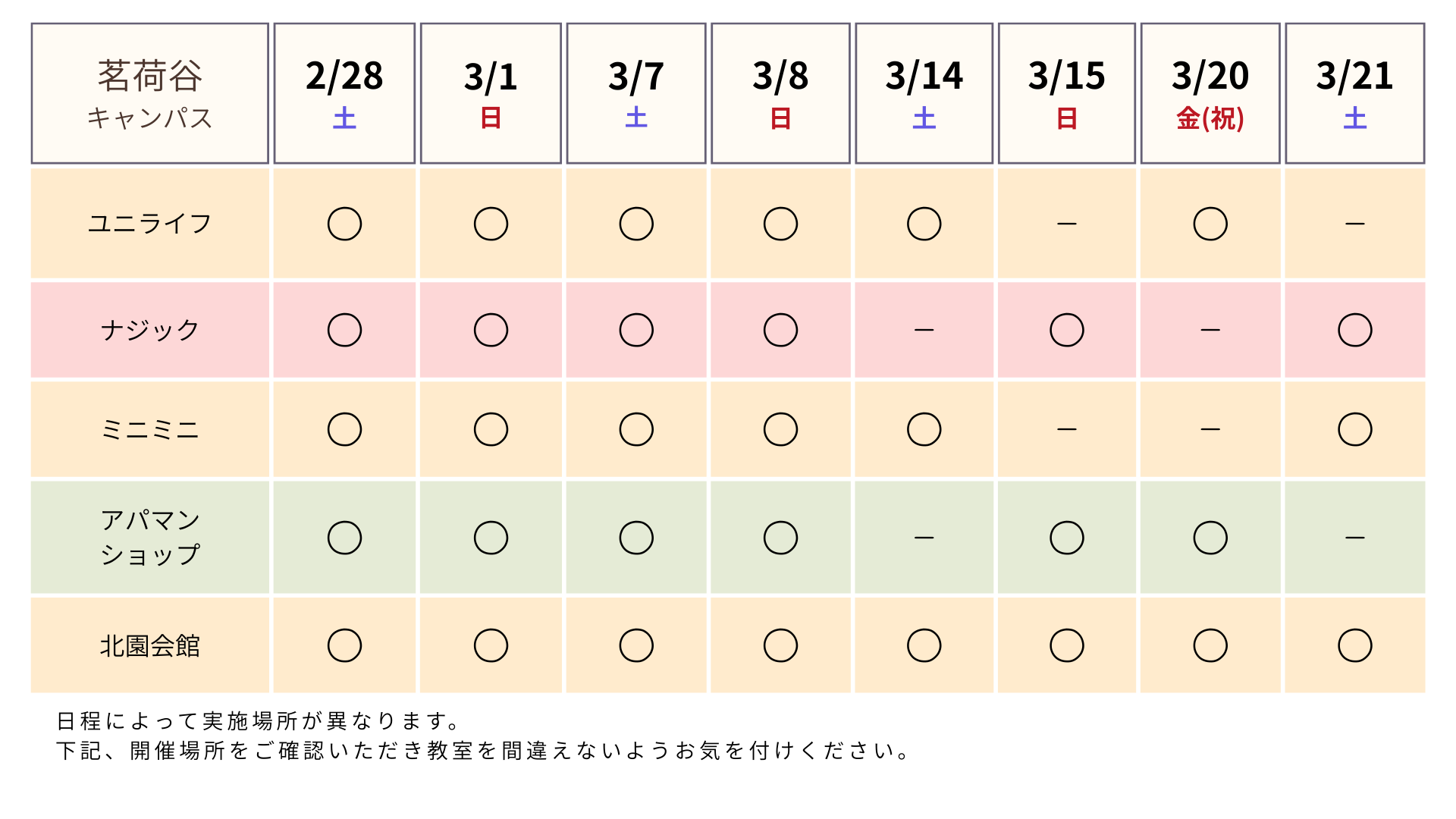 下記、各キャンパスごとの日程表になります。