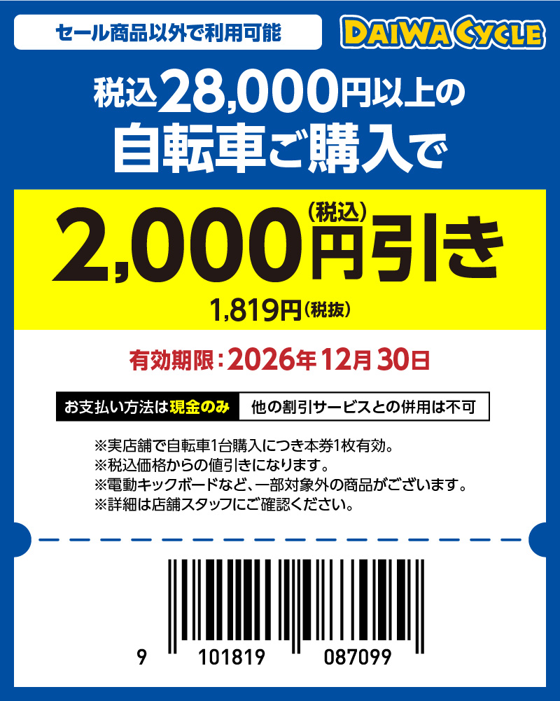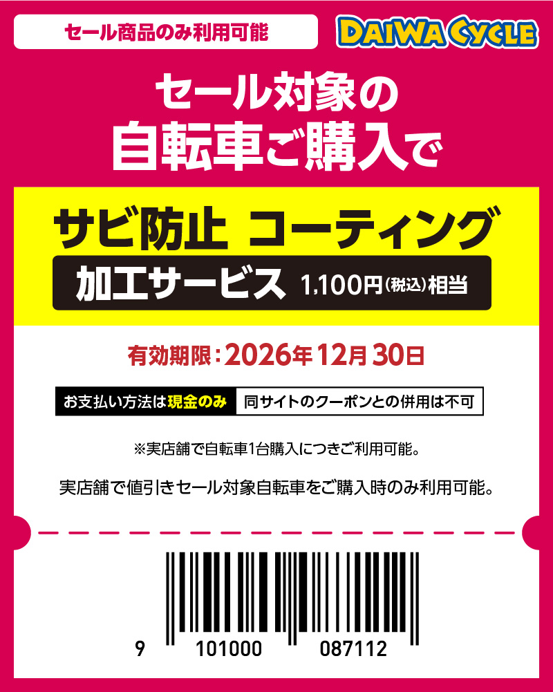 ダイワサイクルで自転車を購入すると、出張修理の出張代金が無料!(修理代は別途費用がかかります)※エリア限定のサービスです。詳細はダイワサイクルHPをご確認ください