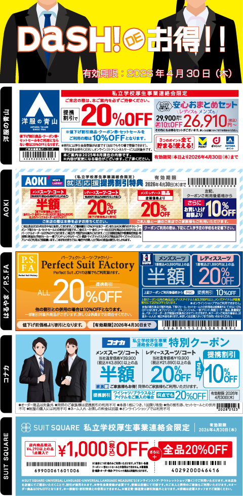 中央大学生協と提携しているスーツ販売店様よりどのクーポンよりもお得な「最大割引」クーポンのご案内です。 こちらのクーポンをプリントアウトし、店舗まで必ずご持参ください。